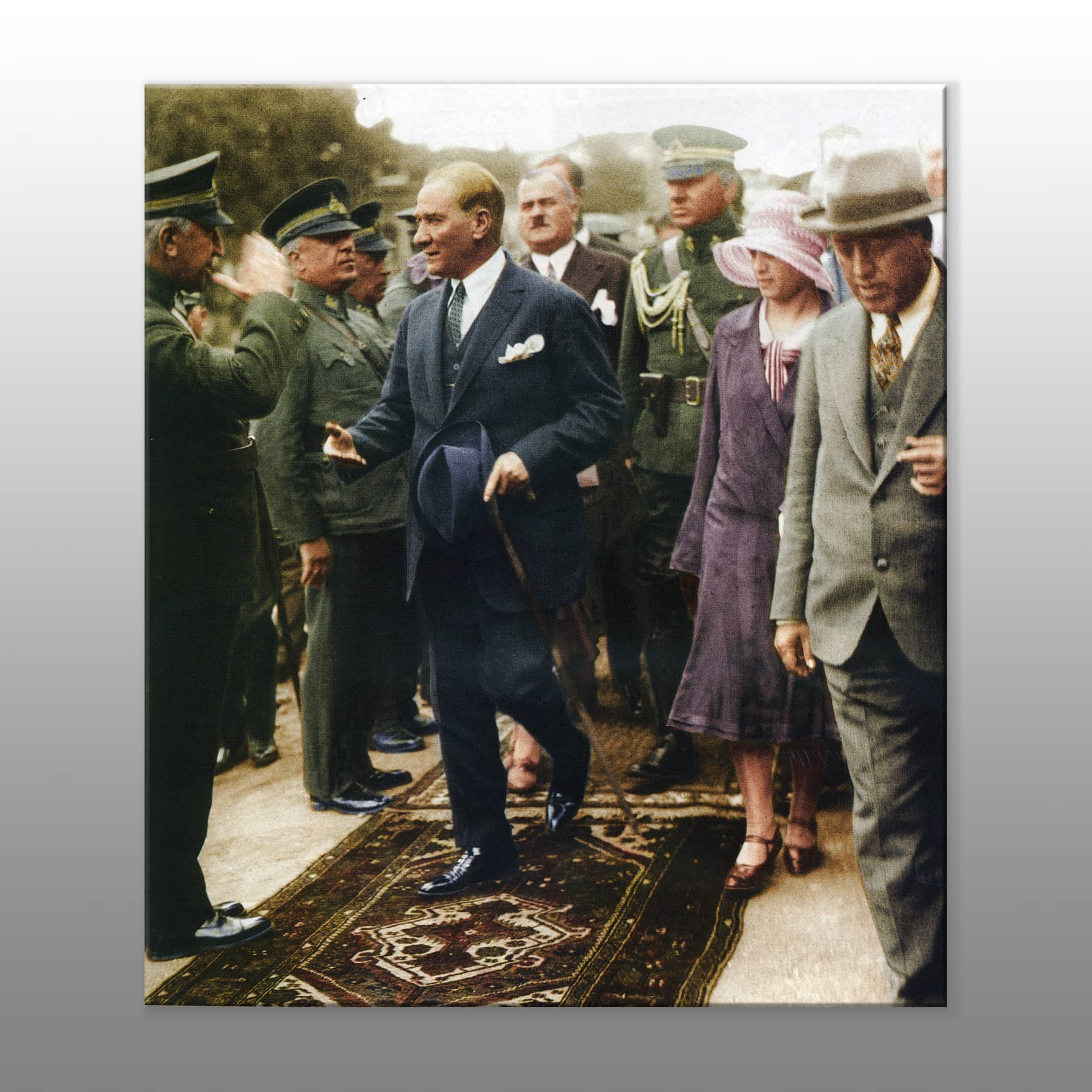 Bu fotoğraf, sadece bir liderin değil, aynı zamanda Türkiye’nin modernleşme sürecinin de simgesidir. Arka plandaki askerler ve davetlilerle birlikte, Atatürk’ün her zaman ileriye bakışını simgeleyen bu an, duvarlarınıza derin bir tarihsel anlam katacak. Fotoğrafın renkli hali, dönemin şıklığını ve Atatürk’ün dünya çapındaki saygınlığını yansıtıyor.