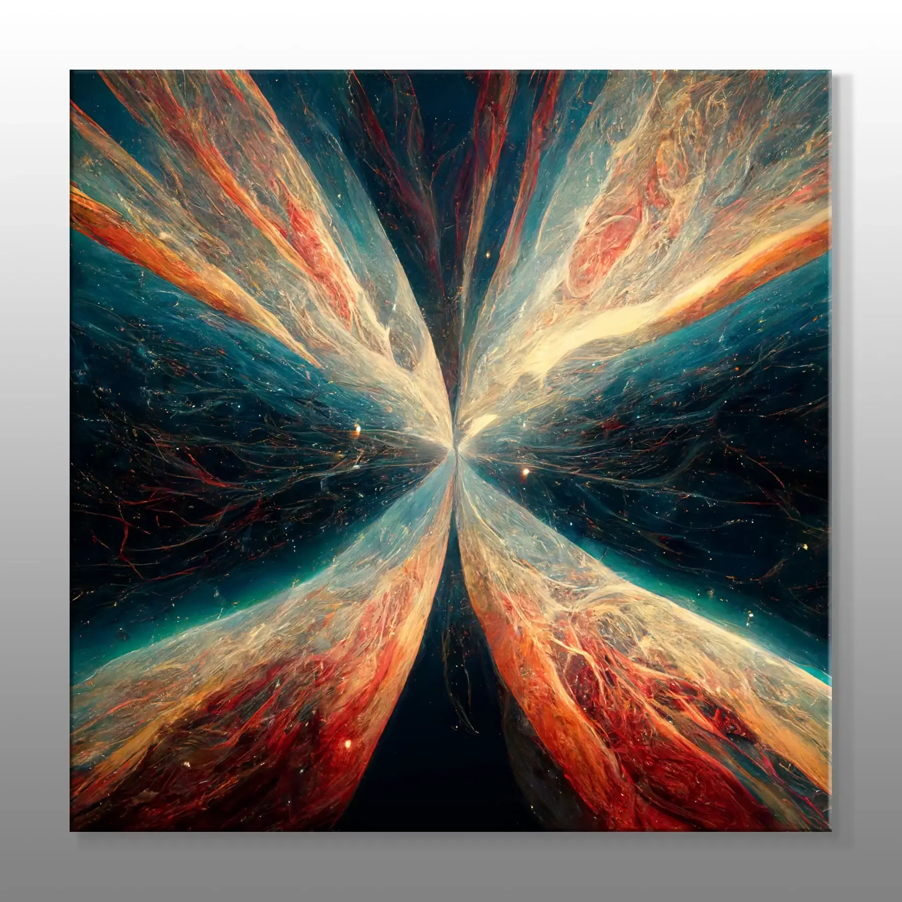 Canlı kırmızı ve beyaz tonlarının akışkan birleşimi, mekâna hareket ve ritim kazandırırken, kontrastların güçlü etkileşimi tabloya derinlik ve modern bir hava katıyor. Kalın fırça dokunuşları ve renk geçişleriyle oluşturulan dokular, izleyiciyi eserin içinde hissettiren enerjik bir atmosfer yaratıyor.
