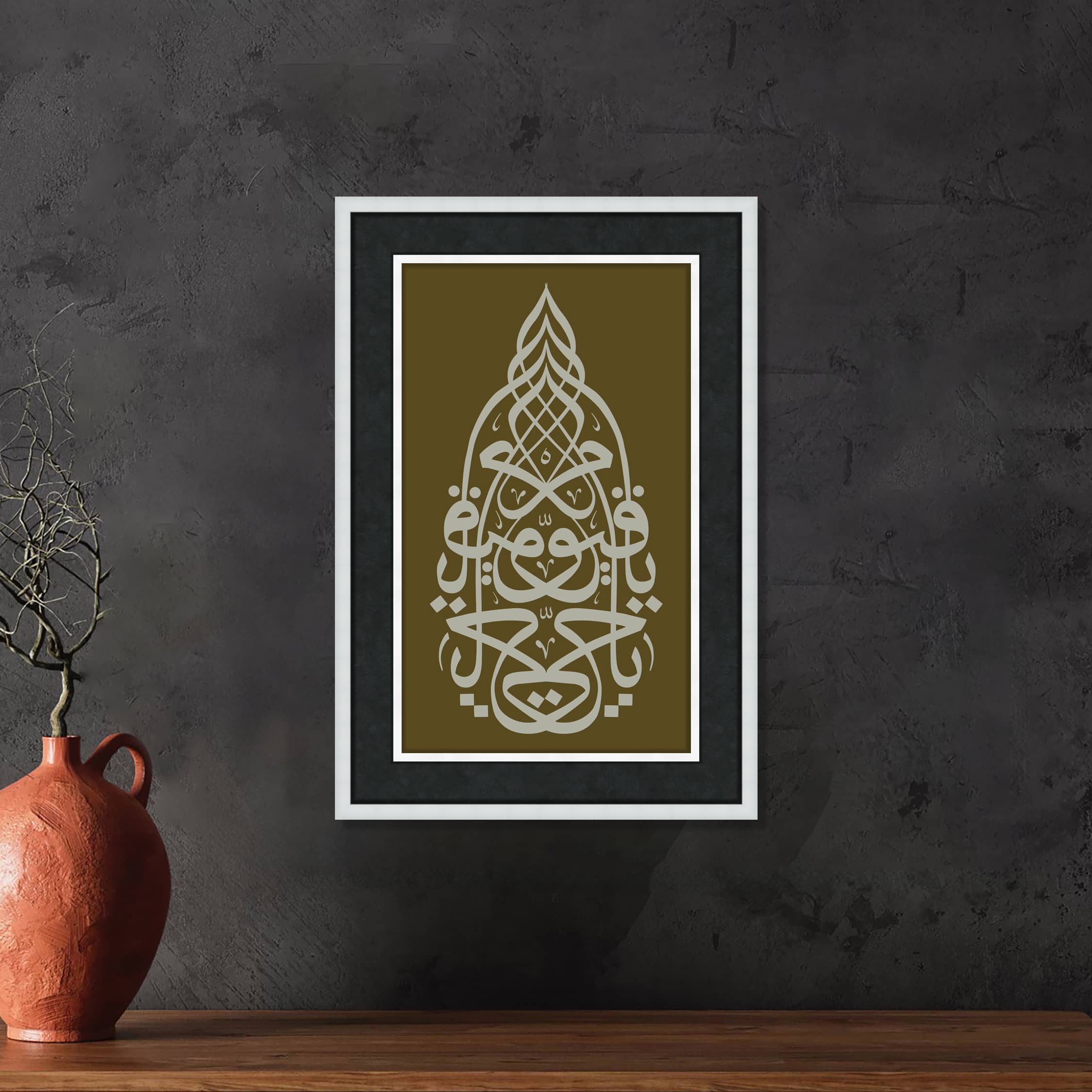 Ya Hayyu Ya Kayyum" ifadesi, "Ey diri ve her şeyi ayakta tutan Allah!" anlamına gelir. Anlam Derinliği: Allah’ın Sonsuz Hayatı ve Kudreti: El-Hayy ismi, Allah’ın diri ve ölümsüz olduğunu, O’nun hiçbir zaman yok olmayacağını ve her zaman var olduğunu ifade eder. Bütün varlıkların varoluşu ve hayatı, O’nun "Hayy" sıfatından gelir. Allah’ın Her Şeyi Ayakta Tutan Gücü: El-Kayyum ismi, Allah’ın her şeyi ayakta tuttuğunu, yönettiğini ve düzenlediğini ifade eder. Bütün varlıkların varlıklarını sürdürebilmeleri Allah’ın Kayyum sıfatına bağlıdır. O, tüm evrenin düzenini koruyan, tüm yaratılmışların varlık sebeplerini elinde tutan yegâne kudrettir. Tevhid ve Allah’a Güven: "Ya Hayyu Ya Kayyum" ifadesi, Allah’ın hem diri (hayy) hem de her şeyi ayakta tutan (kayyum) olduğunu bilerek, O’na mutlak güveni ve teslimiyeti ifade eder. Müslümanlar, her türlü zorluk ve ihtiyaç anında bu isimleri zikrederek Allah’tan yardım ve destek talep ederler. Kur'an-ı Kerim'de Geçişi: Ayetü'l-Kürsi: Allah’ın "Hayy" ve "Kayyum" sıfatları, Kur'an-ı Kerim’in en büyük ayetlerinden biri olan Ayetü'l-Kürsi’de (Bakara Suresi, 255. Ayet) geçer: "Allah, O'ndan başka hiçbir ilah yoktur; Hayy’dır, Kayyum’dur (her şeyi ayakta tutan, koruyan ve yöneten)..." Ali İmran Suresi 2. Ayet: "Allah, kendisinden başka hiçbir ilah olmayandır. Hayy’dır, Kayyum’dur." Bu ayetlerde Allah’ın diri olduğu ve her şeyi koruyup gözettiği belirtilir ve bu iki sıfatın büyüklüğü vurgulanır. Dua ve Zikirlerde Kullanımı: Peygamberimizin (s.a.v.) Dualarında: Hz. Muhammed (s.a.v.), sık sık "Ya Hayyu Ya Kayyum" ifadesini dualarında kullanmıştır. Örneğin, zor anlarda ve sıkıntılı durumlarda bu ifadeyi zikretmiştir. Bir hadisinde şöyle buyurur: "Ya Hayyu Ya Kayyum, rahmetinle senden yardım istiyorum." (Tirmizi) Kalp Huzuru ve İstikrar: Bu zikir, kalp huzurunu, sükuneti ve Allah’a tam bir güveni ifade eder. Müslümanlar, bu zikri tekrarlayarak Allah’tan yardım, istikrar, güç ve destek dilerler. Manevi ve Ruhsal Etkisi: Allah’a Tam Güven ve Teslimiyet: "Ya Hayyu Ya Kayyum" ifadesi, Allah’ın her zaman var olduğunu ve her şeyi kontrol ettiğini bilerek O’na tam bir teslimiyeti ifade eder. Ruhsal Güç ve Dayanıklılık: Bu zikri tekrarlamak, zor zamanlarda ruhsal güç ve dayanıklılık sağlar. Müslümanlar, bu isimleri zikrederek Allah’ın sonsuz kudretine ve yardımına olan güvenlerini ifade ederler. Sonuç: "Ya Hayyu Ya Kayyum", Allah’ın diri ve her şeyi ayakta tutan olduğunu ifade eden iki güzel isimden oluşan bir zikirdir. Bu ifadeyi zikretmek, Allah’ın kudretine, varlığına, korumasına ve yardıma olan güveni ve teslimiyeti güçlendirir. Müslümanlar için zor zamanlarda ve ihtiyaç anlarında sıkça başvurulan bu dua ve zikir, Allah’a olan bağlılığı ve güveni pekiştiren derin bir anlam taşır. Çerçeve , Lamine Çerçeveden üretilmiştir. Çift katmanlı çerçeve kırık beyaz renginde, derinlikli çeçreve kullanılmıştır, Baskı, Hahnemühle, Stüdio Enhenced 190 gr /m² Kağıt Kullanılmıştır. Paspartu; 6 cm Siyah İthal 17 micron kağıt kullanılmıştır. Cam, 2 mm Normal Cam Kullanılmıştır.