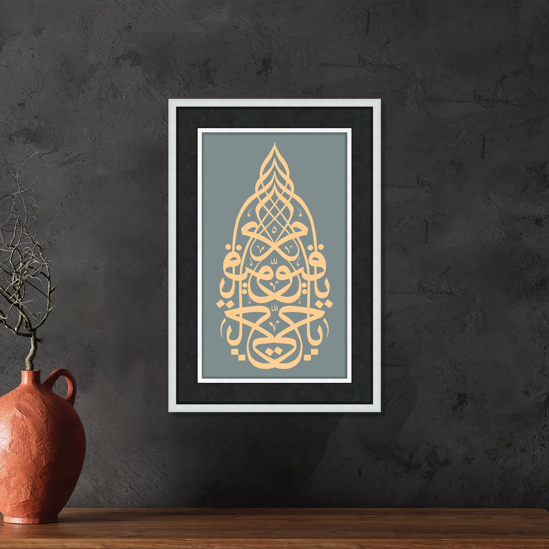 Ya Hayyu Ya Kayyum" ifadesi, "Ey diri ve her şeyi ayakta tutan Allah!" anlamına gelir. Anlam Derinliği: Allah’ın Sonsuz Hayatı ve Kudreti: El-Hayy ismi, Allah’ın diri ve ölümsüz olduğunu, O’nun hiçbir zaman yok olmayacağını ve her zaman var olduğunu ifade eder. Bütün varlıkların varoluşu ve hayatı, O’nun "Hayy" sıfatından gelir. Allah’ın Her Şeyi Ayakta Tutan Gücü: El-Kayyum ismi, Allah’ın her şeyi ayakta tuttuğunu, yönettiğini ve düzenlediğini ifade eder. Bütün varlıkların varlıklarını sürdürebilmeleri Allah’ın Kayyum sıfatına bağlıdır. O, tüm evrenin düzenini koruyan, tüm yaratılmışların varlık sebeplerini elinde tutan yegâne kudrettir. Tevhid ve Allah’a Güven: "Ya Hayyu Ya Kayyum" ifadesi, Allah’ın hem diri (hayy) hem de her şeyi ayakta tutan (kayyum) olduğunu bilerek, O’na mutlak güveni ve teslimiyeti ifade eder. Müslümanlar, her türlü zorluk ve ihtiyaç anında bu isimleri zikrederek Allah’tan yardım ve destek talep ederler. Kur'an-ı Kerim'de Geçişi: Ayetü'l-Kürsi: Allah’ın "Hayy" ve "Kayyum" sıfatları, Kur'an-ı Kerim’in en büyük ayetlerinden biri olan Ayetü'l-Kürsi’de (Bakara Suresi, 255. Ayet) geçer: "Allah, O'ndan başka hiçbir ilah yoktur; Hayy’dır, Kayyum’dur (her şeyi ayakta tutan, koruyan ve yöneten)..." Ali İmran Suresi 2. Ayet: "Allah, kendisinden başka hiçbir ilah olmayandır. Hayy’dır, Kayyum’dur." Bu ayetlerde Allah’ın diri olduğu ve her şeyi koruyup gözettiği belirtilir ve bu iki sıfatın büyüklüğü vurgulanır. Dua ve Zikirlerde Kullanımı: Peygamberimizin (s.a.v.) Dualarında: Hz. Muhammed (s.a.v.), sık sık "Ya Hayyu Ya Kayyum" ifadesini dualarında kullanmıştır. Örneğin, zor anlarda ve sıkıntılı durumlarda bu ifadeyi zikretmiştir. Bir hadisinde şöyle buyurur: "Ya Hayyu Ya Kayyum, rahmetinle senden yardım istiyorum." (Tirmizi) Kalp Huzuru ve İstikrar: Bu zikir, kalp huzurunu, sükuneti ve Allah’a tam bir güveni ifade eder. Müslümanlar, bu zikri tekrarlayarak Allah’tan yardım, istikrar, güç ve destek dilerler. Manevi ve Ruhsal Etkisi: Allah’a Tam Güven ve Teslimiyet: "Ya Hayyu Ya Kayyum" ifadesi, Allah’ın her zaman var olduğunu ve her şeyi kontrol ettiğini bilerek O’na tam bir teslimiyeti ifade eder. Ruhsal Güç ve Dayanıklılık: Bu zikri tekrarlamak, zor zamanlarda ruhsal güç ve dayanıklılık sağlar. Müslümanlar, bu isimleri zikrederek Allah’ın sonsuz kudretine ve yardımına olan güvenlerini ifade ederler. Sonuç: "Ya Hayyu Ya Kayyum", Allah’ın diri ve her şeyi ayakta tutan olduğunu ifade eden iki güzel isimden oluşan bir zikirdir. Bu ifadeyi zikretmek, Allah’ın kudretine, varlığına, korumasına ve yardıma olan güveni ve teslimiyeti güçlendirir. Müslümanlar için zor zamanlarda ve ihtiyaç anlarında sıkça başvurulan bu dua ve zikir, Allah’a olan bağlılığı ve güveni pekiştiren derin bir anlam taşır. Çerçeve , Lamine Çerçeveden üretilmiştir. Çift katmanlı çerçeve kırık beyaz renginde, derinlikli çeçreve kullanılmıştır, Baskı, Hahnemühle, Stüdio Enhenced 190 gr /m² Kağıt Kullanılmıştır. Paspartu; 6 cm Siyah İthal 17 micron kağıt kullanılmıştır. Cam, 2 mm Normal Cam Kullanılmıştır.
